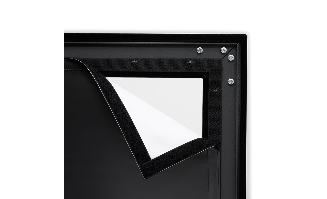 Специальные функцииАлюминиевая рама шириной 8 см со скосами 3 см покрыта бархатом, поглощающим проекционный свет. Плоская поверхность экрана подходит для любых типов видео. Рама и проекционное полотно могут быть изготовлены на заказ.